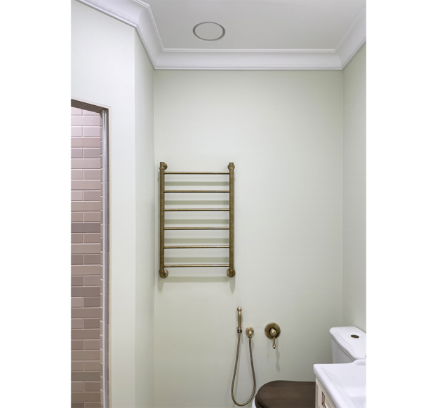 Диффузор монтируется в одной плоскости с натяжным потолком.